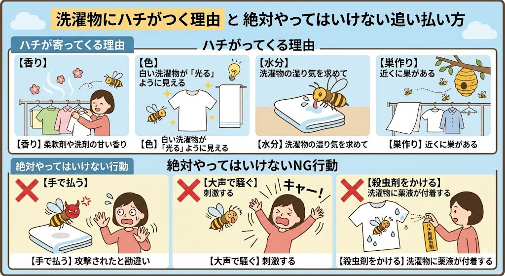 今回は、洗濯物にハチがつく意外な理由から、刺されないための正しい対処法、そして命に関わる「絶対やってはいけないNG行動」まで、詳しく解説します。