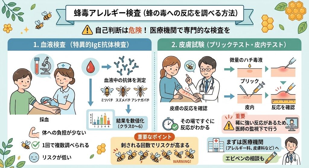 ハチ毒アレルギーを調べるには、皮膚科、アレルギー科、あるいは内科などの医療機関を受診することが不可欠です。現在、最も確実とされる検査には主に血液検査、皮膚試験の2つの手法があります。