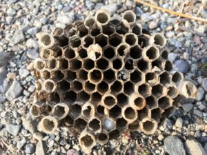 - 巣の特徴お椀をひっくり返したような「シャワーヘッド型」が特徴です。外から六角形の穴(幼虫の部屋)が丸見えで、灰色や薄茶色をしています。